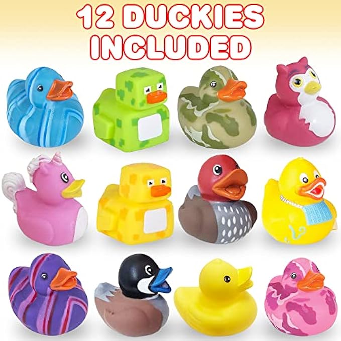 • BULK PACK OF 12: Get the best bang for your buck as you spark smiles. Each pack includes 12 (2”) rubber duckies. Little boys and girls will love the variety of colors and characters. Dish them out and hear the giggles follow. (Color and character assortment may vary)