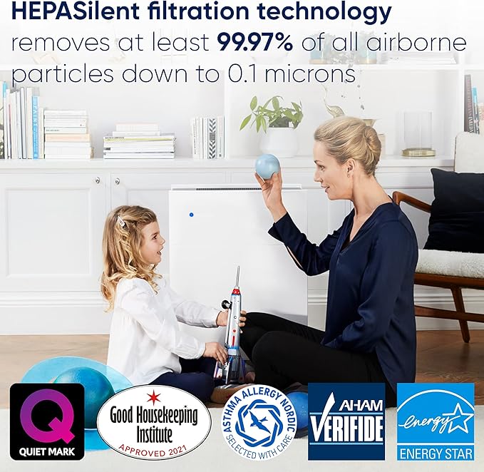 • HEPASilent technology leverages electrostatic charge and mechanical filtration to deliver true HEPA performance capturing 99.97% of airborne pollutants including dust, mold, pet dander, and pollen for relief from allergies and asthma