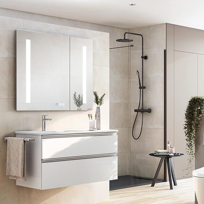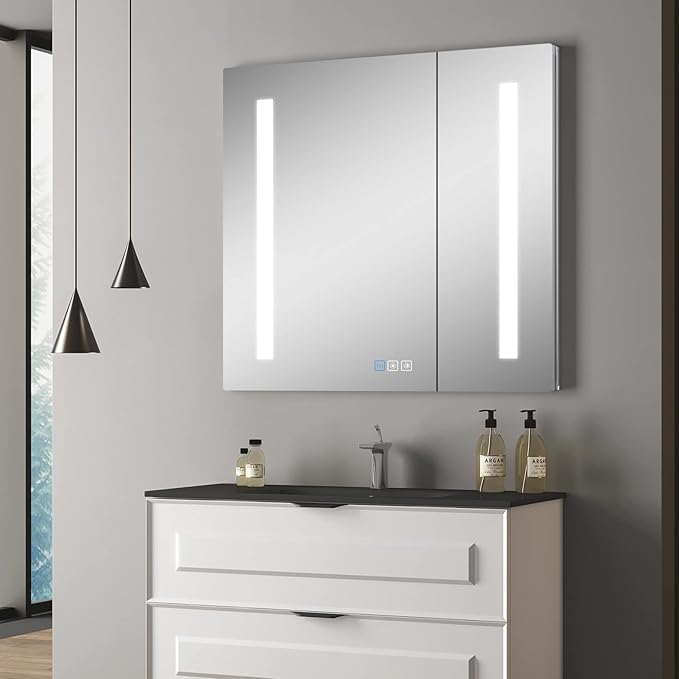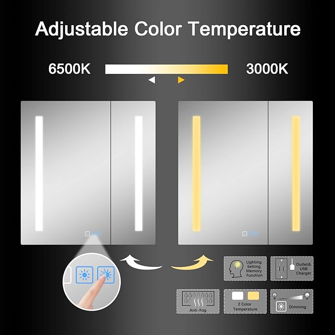 【Practical Design】The medicine cabinet is made of anodized aluminum shape, which has strong anti-rust ability and long service life. Interior mirrors on door backs and cabinet backs; with adjustable tempered glass shelves and soft-close hinges.